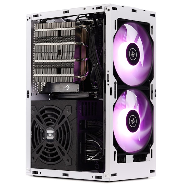 There are several models of the SSUPD Meshlicious available. Choose between fully mesh or glass editions, and in either black or white. This model is the Full Mesh White , with a PCIe 3.0 riser cable included. All four panels on the exterior are mesh and in a clean white finish.